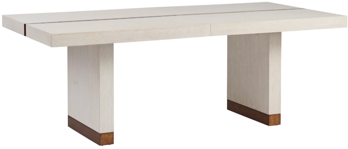The 88-inch Vista dining table has a decorative metal inset that runs the length of the table and is repeated on the two 20-inch leaves which extend the table to 128-inches. Decorative metal in the Calais brass finish also trims the base.Read More