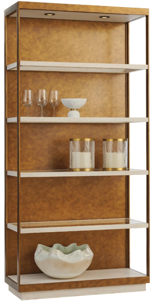 The dramatic height of the 96-inch Whitman etagere is emphasized by its decorative metal frame and back panel that supports four stationary wood-framed ultra-clear glass shelves. They make a great design statement when shown in pairs.Read More