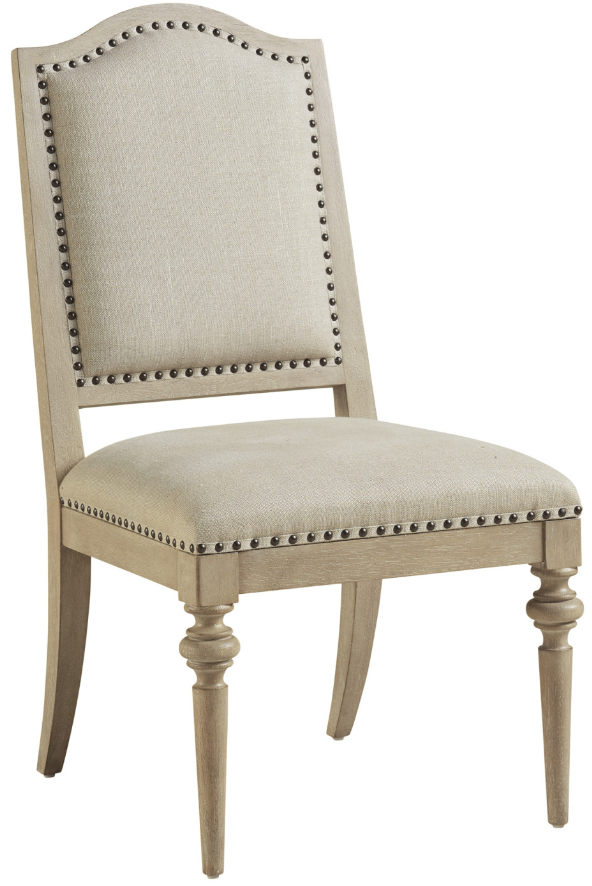 The Aidan dining chair design features a graceful arched top, smoked nickel nailhead trim on the seat and inside back, with turnings on the front tapered legs. The standard fabric, Moonshadow, is 100% natural linen in an ivory and fawn coloration with an exceptionally soft hand.Read More