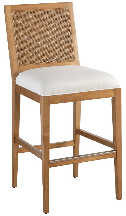 The Cleo Bar stool features an upholstered seat, a double-caned back, and a metal kickplate finished in burnished brass. The standard fabric is 2275-12 cloud, which is a performance fabric with a soft hand in a linen-white coloration.Read More