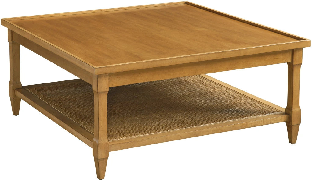 The 42-inch square Temple cocktail table offers a sophisticated blend of style and function. It features a raised gallery edge around the wooden top, adding a refined touch, while the woven cane shelf at the bottom provides extra storage or display space. This versatile table makes a striking addition to any living room.Read More