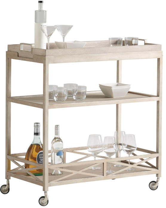 The Anacapa bar cart is one of our favorite pieces, blending metal and wood, with a removable tray on the top, industrial casters and a contemporary x-pattern on the gallery surrounding the bottom shelf. The metal is finished in a burnished sauternes coloration.Read More