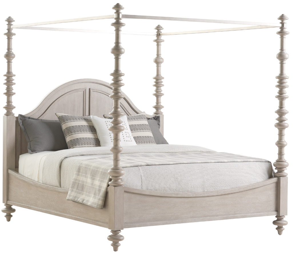 The dramatic turnings on the Heathercliff poster bed make a strong design statement, capped by a collared metal canopy frame in a burnished sauternes finish. The fluid lines of the arched headboard and concave footboard lend a sense of balance to the design.Read More