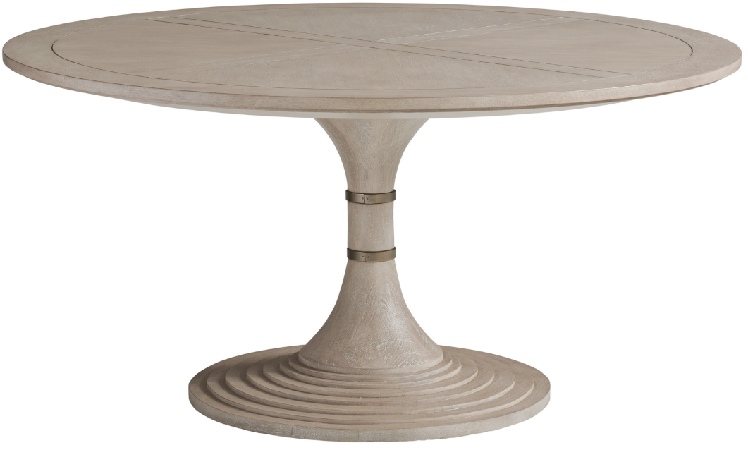 The 60-inch dining table features an elegant hour-glass design, with two decorative metal collars on the pedestal and a contemporary waterfall detail on the base. The silhouette is ideal for five to dine together. The top features a bordered 4-way match of quartered hickory veneer.Read More