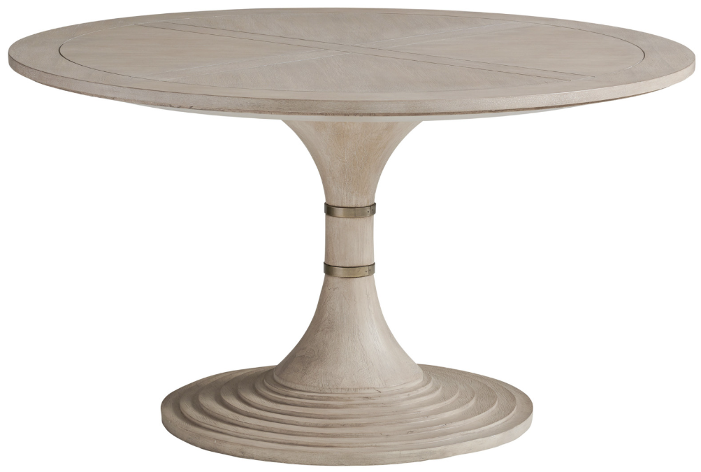 The 54-inch dining table features an elegant hour-glass design, with two decorative metal collars on the pedestal and a contemporary waterfall detail on the base. The silhouette is ideal for use as a center table, or intimate dining for four. The top features a bordered 4-way match of quartered hickory veneer.Read More
