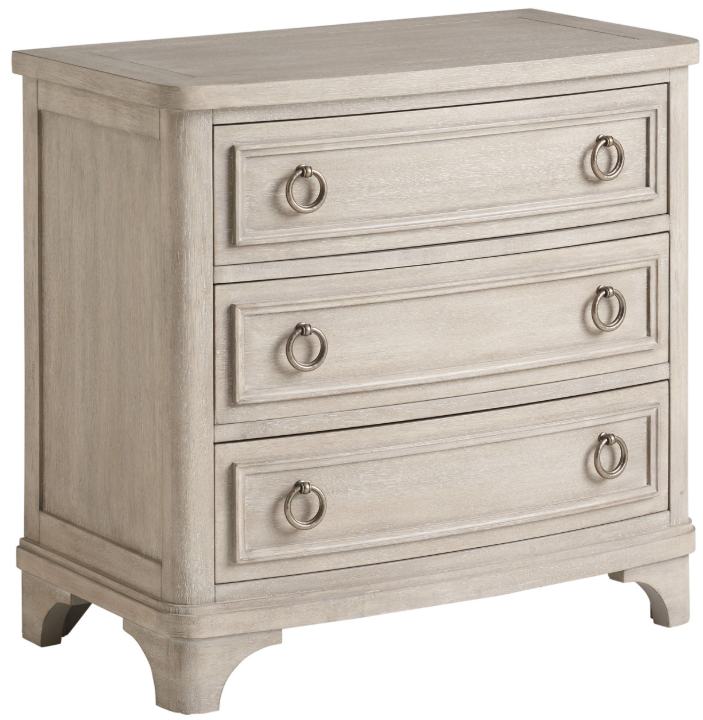 For a smaller footprint, with generous storage and soft bowfront design, the 34-inch Trancas three drawer nightstand is a great option. The design features raised moldings around the drawer front and sits on bracket feet.Read More