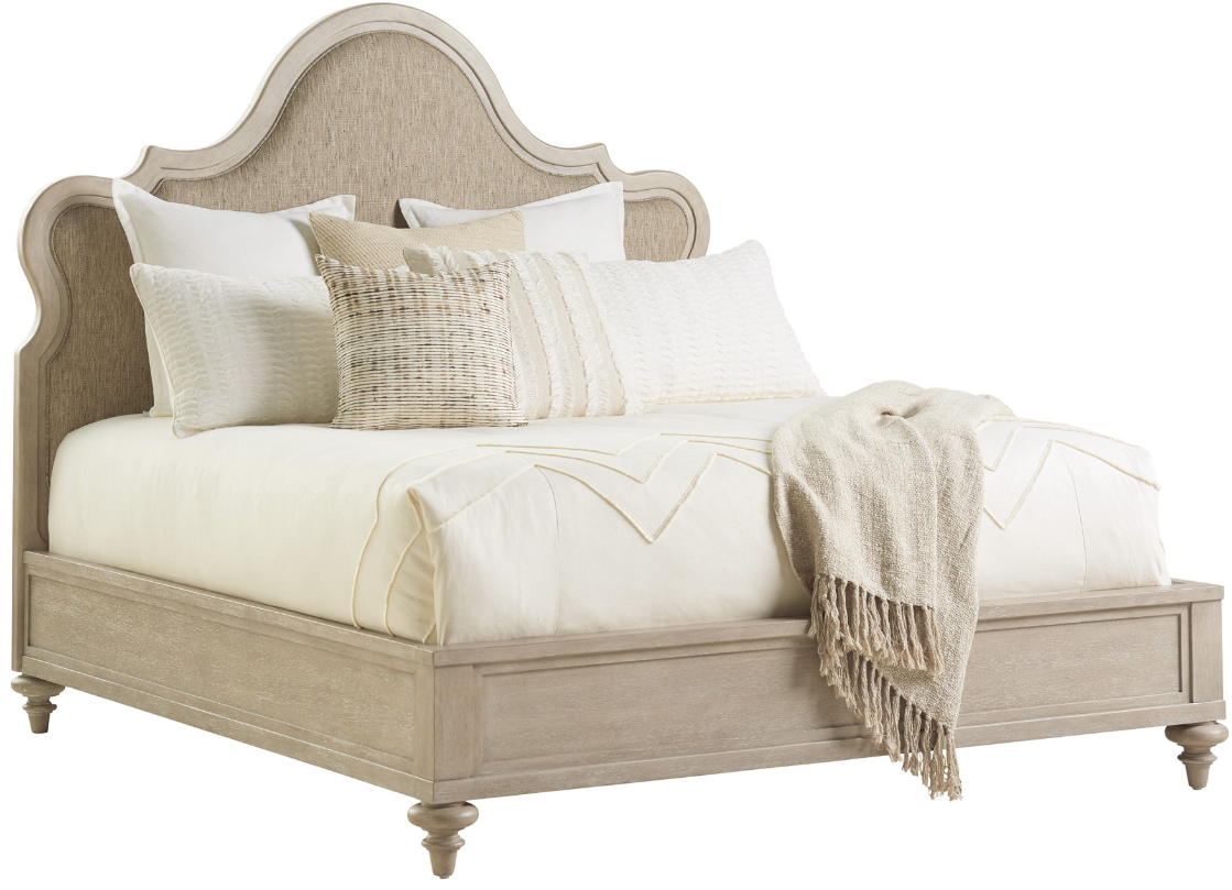 The Zuma upholstered bed blends sweeping curves on the crown of the headboard with a padded upholstered panel, paired with a platform footboard and side rails, and turned bun feet. The standard fabric, Seadrift, is a textural woven with the look of raw silk in shades of ivory, taupe, and mocha.Read More