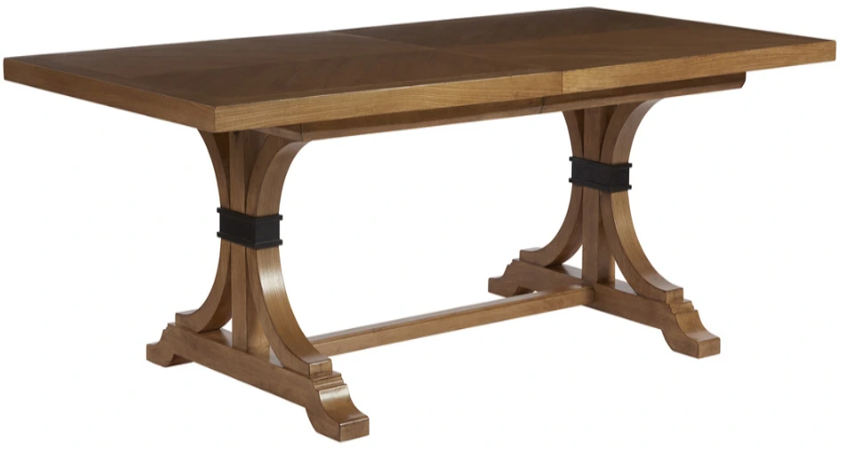The 88-inch Oceanfront dining table, with two 20-inch leaves, comfortably seats up to twelve guests. The trestle base features decorative metal collars that accent the soft curvature of the legs.Read More