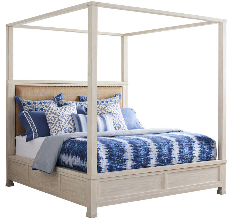 The Shorecliff canopy bed offers a dramatic interpretation of new traditional style. The headboard fabric, in a natural raffia coloration, is framed with aged bronze nailhead trim, creating an ideal backdrop for showcasing layers of pattern and color on the bedding ensemble.Read More