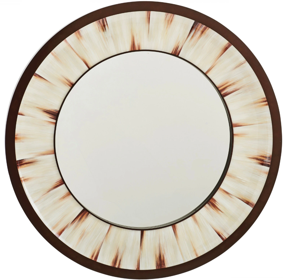 The Academy mirror features a radiating faux horn design with soft concave movement toward the center. Decorative metal trimming on the inside of the frame pairs well with the white oak on the outside perimeter in the Canyon finish.Read More