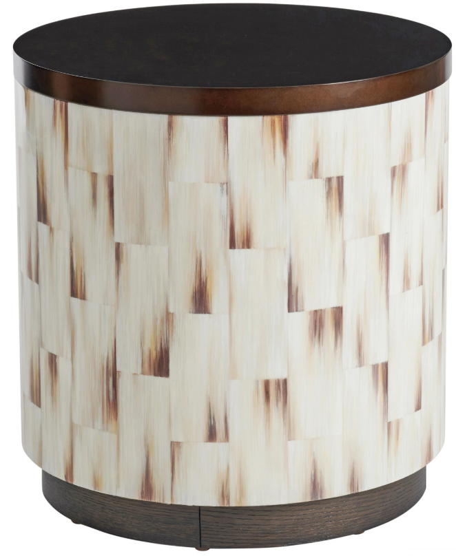 The Barclay and Butera by Lexington Park City Crescent Commode End Table features a burnished bronze finish with a beige and brown base. Its sturdy construction ensures lasting durability, while the compact design provides convenient storage. A versatile addition to any room, it blends warmth and functionality effortlessly.Read More