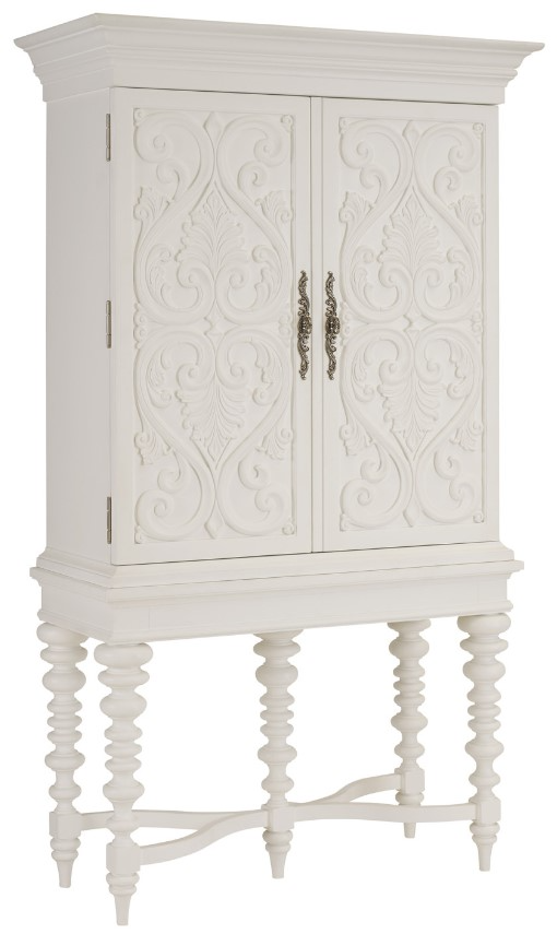 The Arezzo bar cabinet features bold carved overlays on the doors and five tapered turned legs on the base, connected by a serpentine stretcher design. The piece is 88-inches tall. The doors open to 170 degrees with automatic stops.Read More