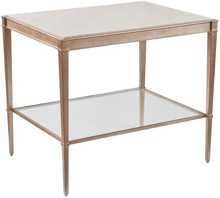 The Bulgari end table was designed to pair with the cocktail table of the same name. It features an inset honed Bulgari Beige marble top, an inset tempered glass shelf, and a metal base with tapered legs finished in rose gold over silver leaf.Read More