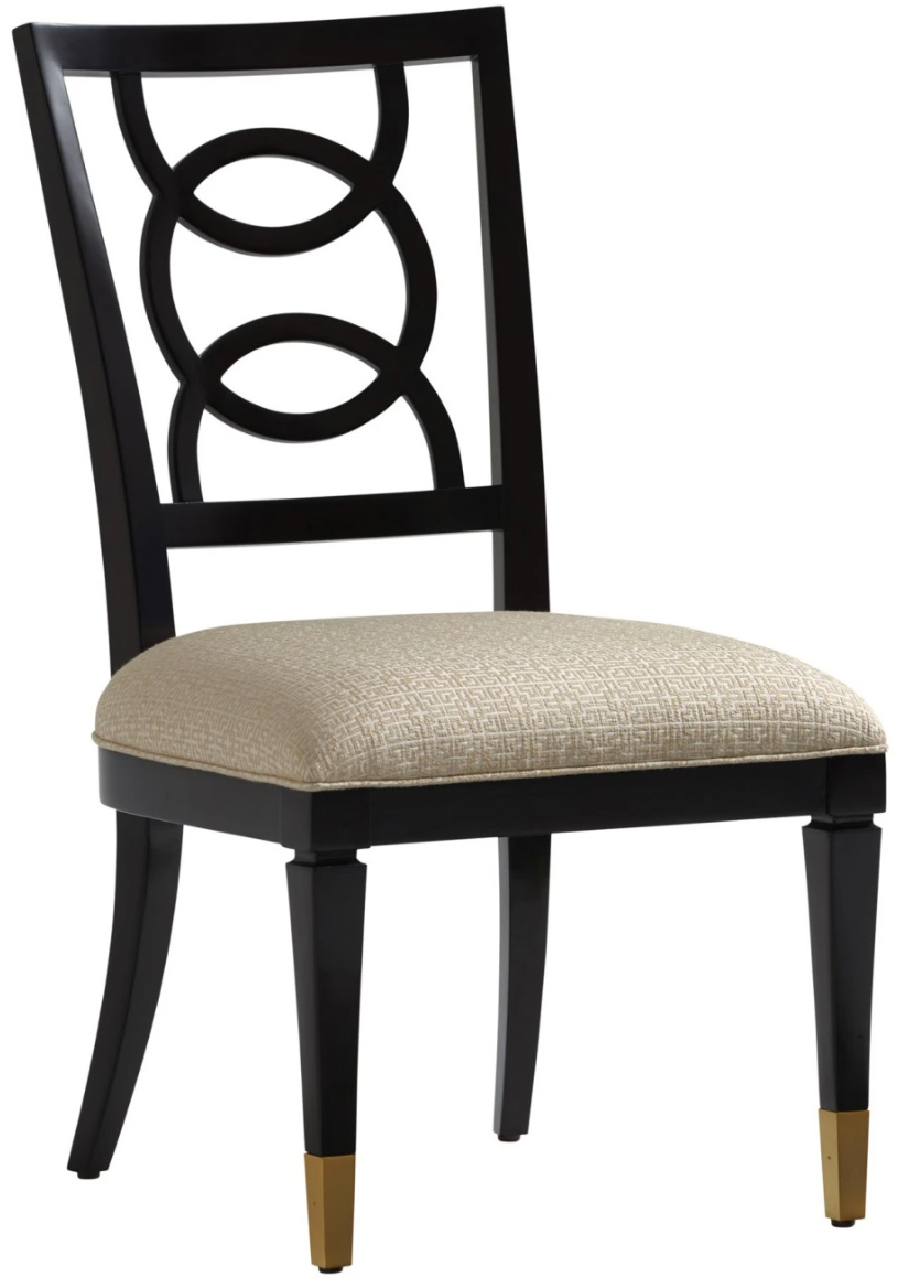 The Pierce arm and side chairs showcase the dramatic intersecting ring design on the chair back, paired with a comfortable upholstered seat and tapered legs with satin gold ferrules. Chairs are standard in fabric 154311 Westport, which is a tone-on-tone contemporary geometric in shades of ivory and taupe.Read More