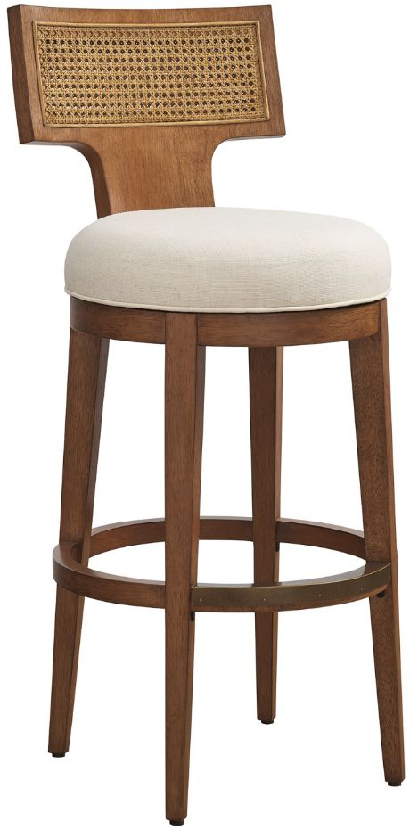 The Calavera swivel bar stool features double-walled woven cane on the backs and upholstered seats. There is a kick plate on the footrests, finished in satin gold. The designs are standard in 2343-11 Sailview, an indoor performance fabric with a linen weave and soft hand. The stools are also available in custom fabrics or leathers.Read More