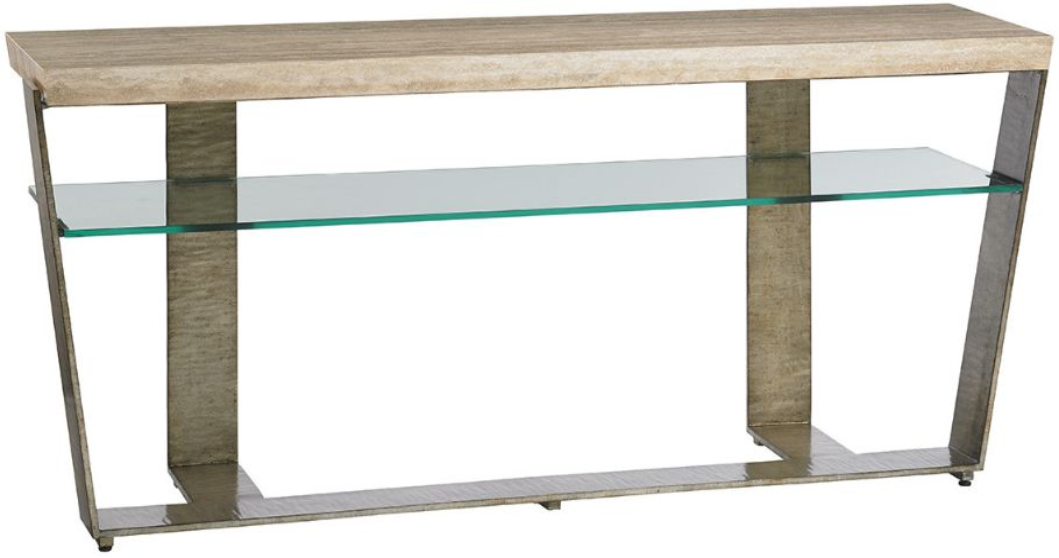 The console makes a strong architectural design statement, with a metal base in burnished silver leaf, a stationary glass shelf and a 71-inches silver travertine top. The design is perfect for the living room, dining room or entry hall and can be positioned in either direction for a signature look.Read More