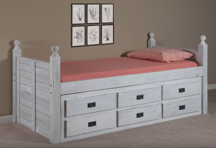 Simple and full of style, this Antique White Full Panel Post Captain Bed will set the tone for the whole space. It offers spacious under-bed drawers that create ample storage space for your essentials. Made of solid pine, it will provide years of enjoyment.Read More