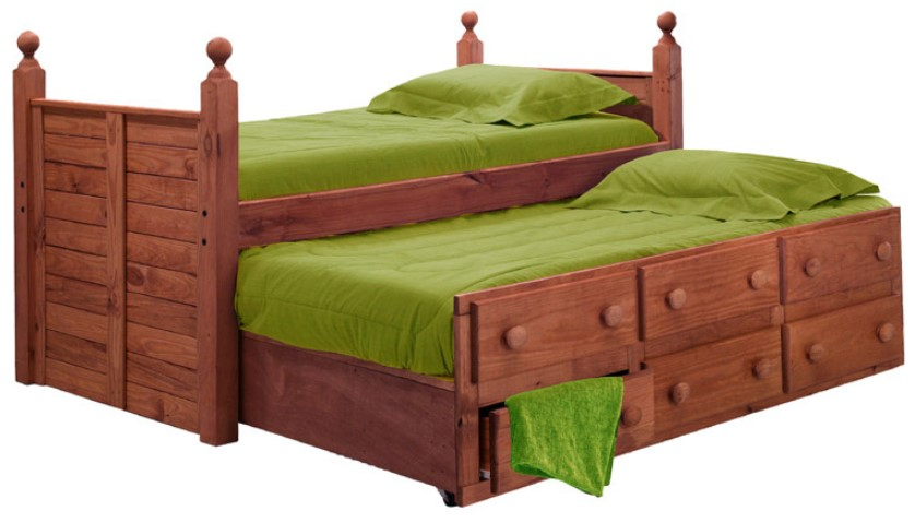 Simple and full of style, this Mahogany Twin Panel Post Captain Bed with Trundle Unit will set the tone for the whole space. It offers spacious under-bed drawers that create ample storage space for your essentials. Made of solid pine, it will provide years of enjoyment.Read More
