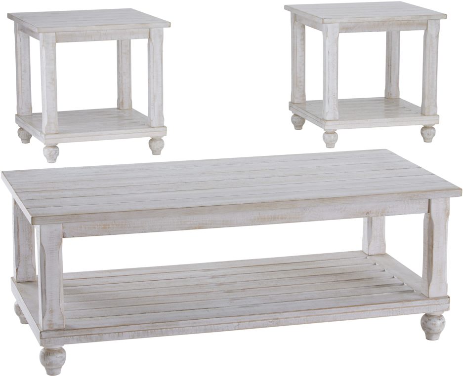 This Cloudhurst table set trio includes 2 end tables and 1 coffee table with a rustic, planked tabletop design and slatted bottom shelves, in a distressed, white finish.