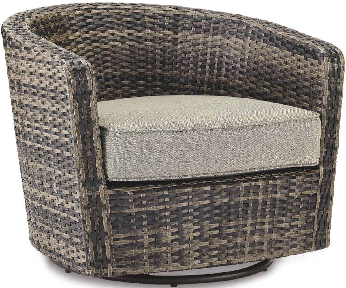 Easy-clean Nuvella® fabric in an approachable gray covers the comfortable cushion. Crafted with sturdy, rust-proof aluminum, this swivel chair is sure to weather the seasons beautifully.