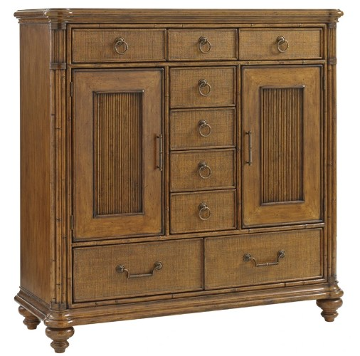 The handsome design of the chest offers generous storage, with nine drawers and two adjustable shelves behind the left and right doors. Bamboo carved posts with leather wrapped pencil rattan accents complement two wood framed doors with pencil rattan panels.Read More