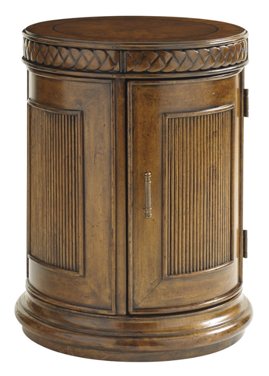 This round end table showcases several Bali Hai design motifs including the decorative carved braid, framed pencil rattan door panel and intricate detailing of woven rattan in the hardware. Its top is comprised of quartered Cherry veneer with a beautiful Maple border and Ebony inlay.Read More