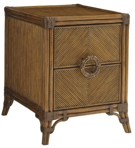 The chairside chest features a refined pencil rattan top with rattan border and leather wrapped corners. A seemingly continuous piece of hardware actually serves drawer pulls for two separate drawers. Its finished back allows the chest to be arranged in a variety of ways.Read More