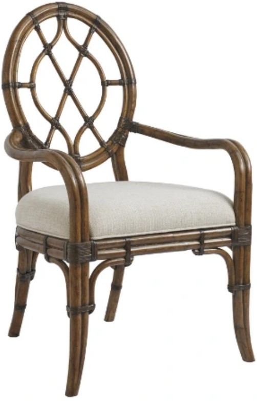 The oval back arm chair features a leather wrapped rattan frame, comfortable upholstered seat and a leather wrapped bent rattan back. It is available as shown in its standard fabric: Sailcloth, which has a tight linen weave construction in an ivory and gold coloration.Read More