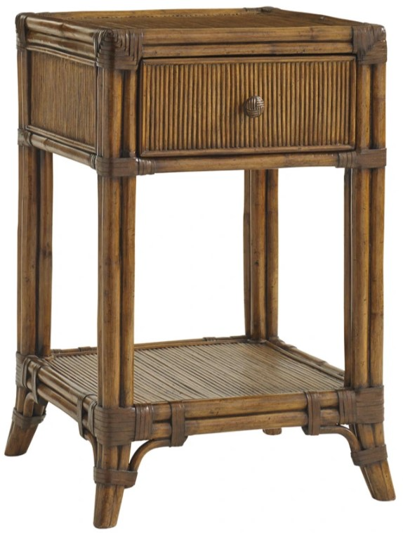 The smallest of the three nightstands in the group, this bedside table features a leather wrapped pencil rattan drawer box on saber shaped rattan legs. One pencil rattan shelf provides more storage, while a finished back allows for a variety of placements.Read More
