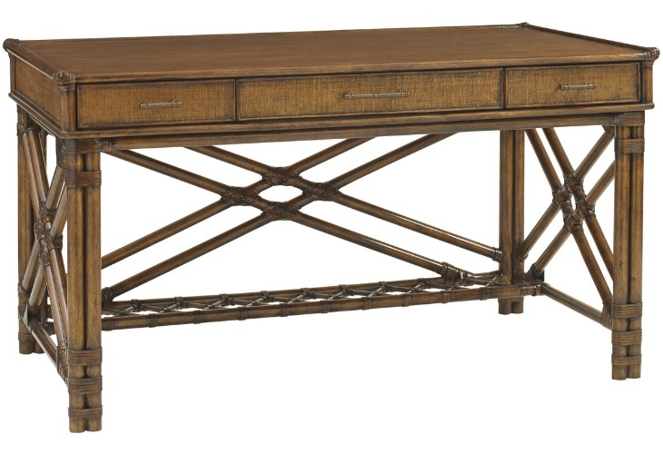 For additional storage, choose the desk combination 593-933C with the enchanted Isle box of drawers, which consists of four drawers and a decorative gallery of leather wrapped rattan.