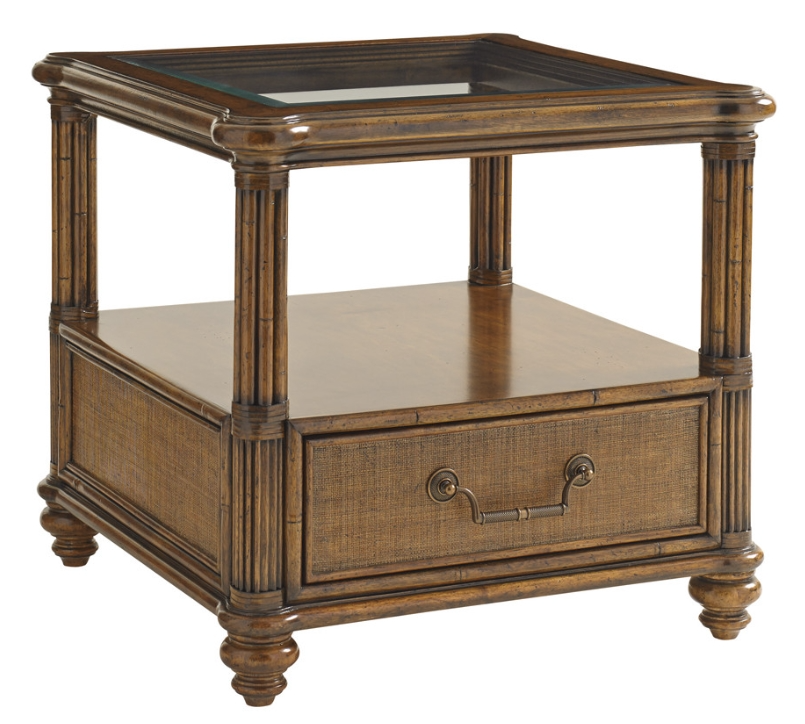 Mixed materials and meticulous detailing create a sophisticated island look. The end table features a wood framed glass top, bamboo carved posts with leather wrapped pencil rattan accents and a finished back. Its one drawer and open shelf provide both storage and display.Read More