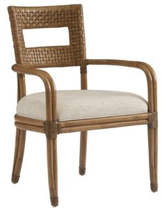 The Delano arm chair offers a distinctive look for the dining room, featuring a leather-wrapped rattan frame and a concave open-back design in woven split rattan. The upholstered seat is standard in fabric 2340-12 sandhill, but is also available in custom fabrics or leathers, including COM.Read More