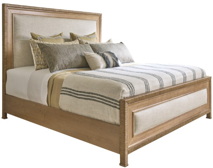 The Grand Isle bed features an upholstered headboard and footboard, framed with a mitered concave wooden molding in the sunwashed finish and wrapped split rattan on the perimeter. The bed is standard in fabric 2340-12 sandhill, an indoor performance fabric with a linen weave construction and a soft hand in shades of ivory and taupe.Read More
