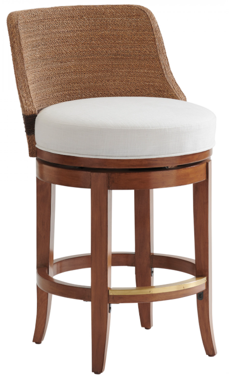 Offers swivel functionality, the relaxed look of twisted Lampakanai on the backs, a metal footrest on the base, and the ability to customize the upholstered seat in your choice of fabric or leather. The pieces are standard in 229211 palmdale, which is an indoor performance fabric with a linen weave in a crisp winter-white coloration.Read More