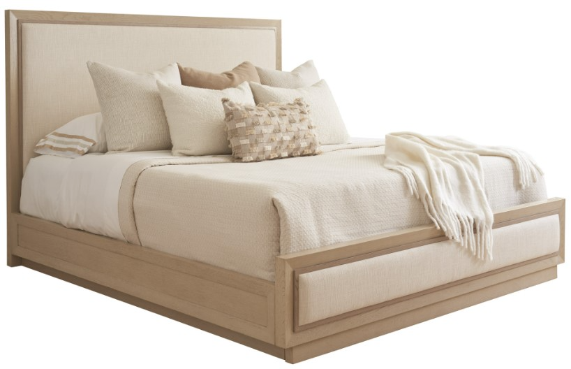 The Grayson bed features upholstered panels in the headboard and footboard framed by mitered trim in the shadow finish. Chamfered moldings frame the perimeter of the side rails, which are lower to the floor, offering a more contemporary profile. The recessed plinth base gives the bed a floating appearance.Read More