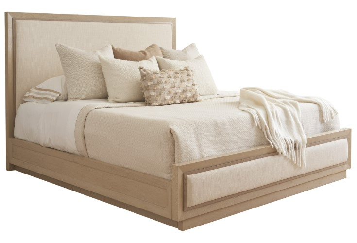 The Grayson bed features upholstered panels in the headboard and footboard framed by mitered trim in the shadow finish. Chamfered moldings frame the perimeter of the side rails, which are lower to the floor, offering a more contemporary profile. The recessed plinth base gives the bed a floating appearance.Read More