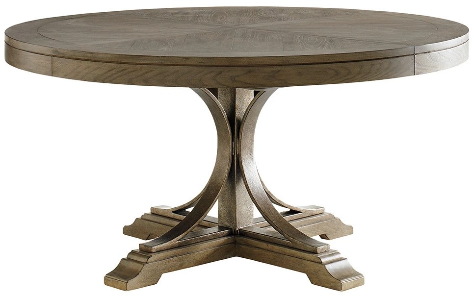 The sweeping textured metal pedestal rests on a wooden base comfortably seating 4 in the round, or add the single 22-inch table leaf to seat 6. The 58-diameter four-way v-match gray elm veneer top is framed by straight-cut borders while the single 22-inch table leaf features straight-cut veneer pattern.Read More