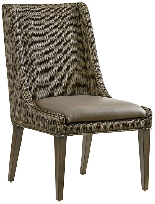 The v-weave woven rattan frame with upholstered seat adds visual interest around the dining table and offers appreciation to natural materials artfully constructed by a craftsman. This side chair is available only as shown in the smoke gray finish with tapered legs, and the soft and durable synthetic leather in a rich dove gray.Read More