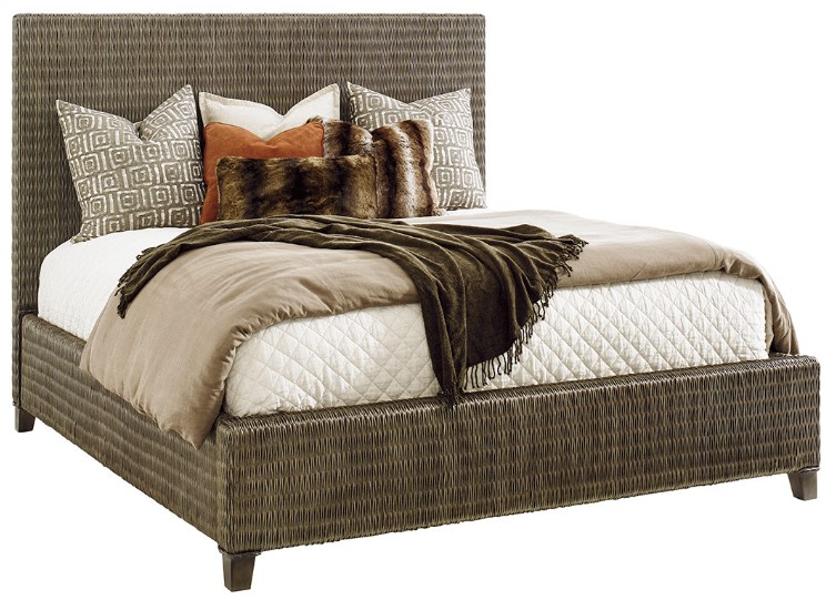 The exposed feet are wood, but the headboard, footboard and side rails are woven rattan carrying the design throughout the complete bed and the finish is the perfect backdrop for any bedding. Box springs required.