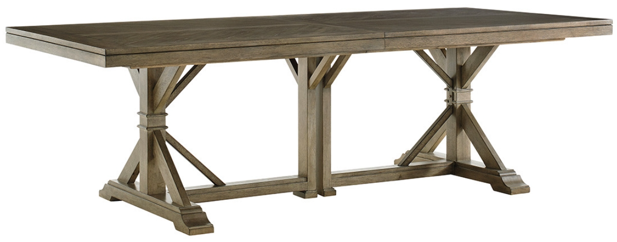 The textured metal trestle base separates when adding one or both 24-inch leaves ensuring ample leg room and comfort for up to 10 people. Without any leaves, the table top is a 4-way v-match Gray Elm veneer framed by straight-cut borders.Read More