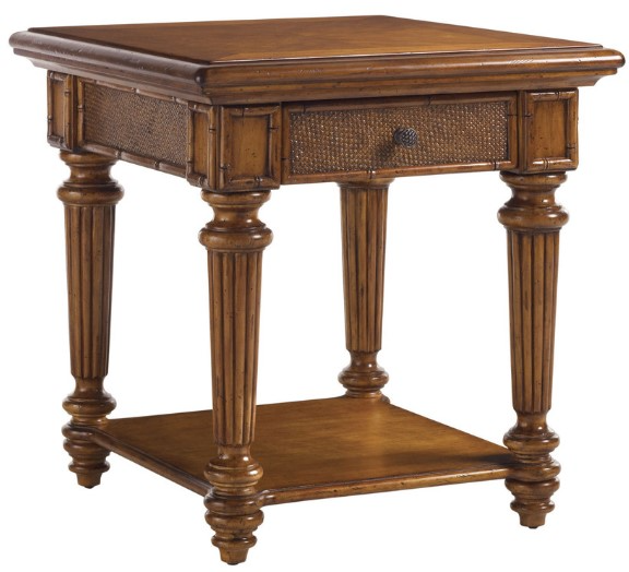Attractive and interesting would be a complement we would all appreciate hearing, and it is evidenced here. The balance of woven rattan and framed bamboo on the sides, including the drawer front, with the carved leg and lower shelf are stunning.Read More