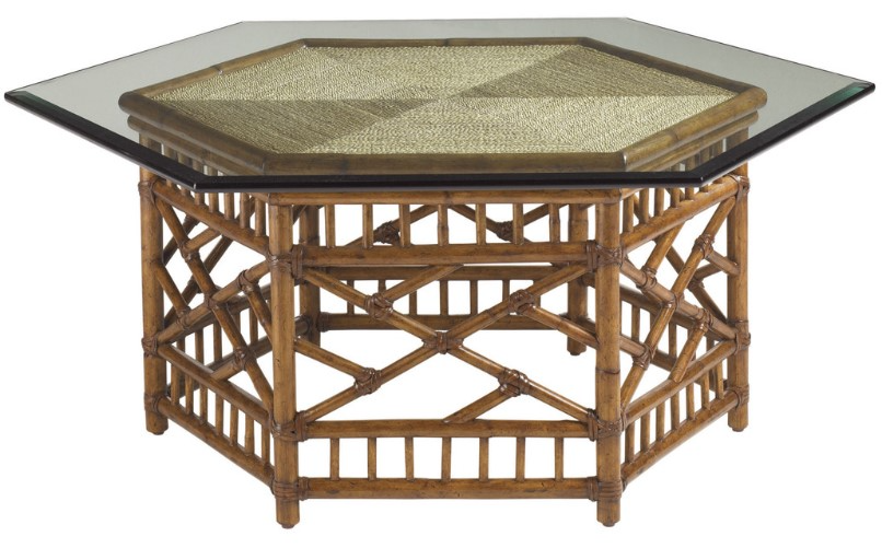 The six-sided woven rattan base with leather binding is reflected in the matching angles of the enlarged glass top. Similarly, the woven lampakani is presented in six triangles to replicate yet draw the entire design to a center focal point.Read More