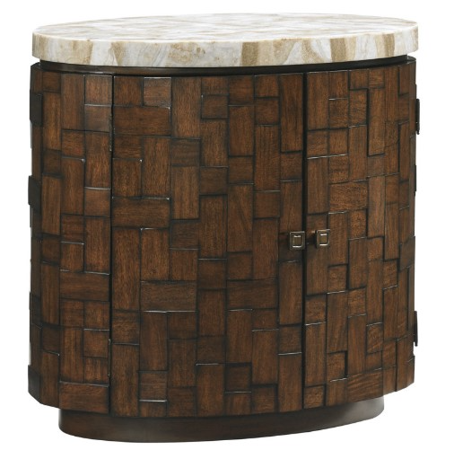 Designed to work as a nightstand or a lamp table, the soft oval shape features a matched pattern of Gmelina blocks and a stone veneered top featuring warm shades of ivory and taupe.Read More
