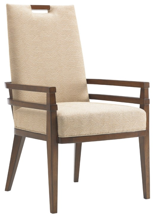 Fully upholstered, this dining arm chair features a functional exposed wood handle at the top and elegant wrap-around wooden frame design. Available as shown in fabric cresting waves - a contemporary art deco geometric pattern in a warm gold coloration, inspired by cresting ocean waves.Read More