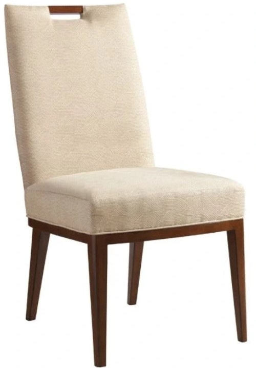 Fully upholstered, this dining side chair features an exposed wood handle at the top creating a functional, yet stylish look. It is available as shown in fabric cresting waves - a contemporary art deco geometric pattern in a warm gold coloration, inspired by cresting ocean waves.Read More