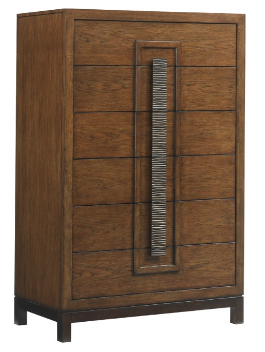 Featuring six drawers, the chest showcases the collection's signature custom hardware. The artisan pulls look like a single piece from a distance, but are actually separate sections on each drawer front. The contemporary molding surrounding the hardware draws attention to the design by framing it on the piece.Read More