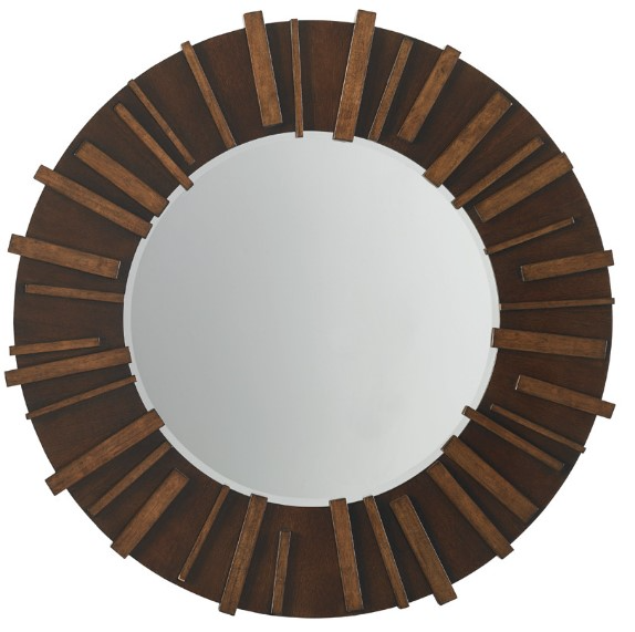 An asymmetrical slat pattern is enhanced by a dark hickory frame to create a bold design statement. The plate features a 1.25 inch bevel and is 30 inches in diameter. This piece will make a bold statement to your bedroom.Read More