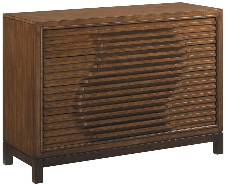 A striking serpentine design in relief on the faces of the four drawers defines this hall chest. The piece has a contrasting walnut finished base, and can be bunched for even greater impact. It has four drawers.Read More