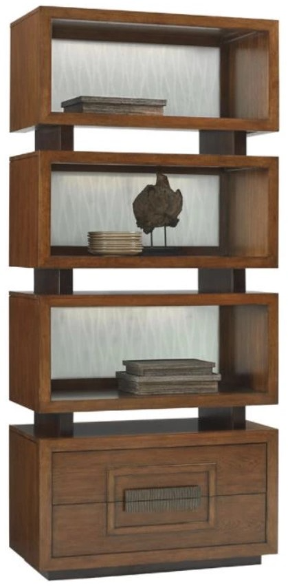 Offering storage in two drawers at the bottom and open display in three tiers, this unique bookcase offers function as well as elegant design. Wavy sea glass back panels are back-lit with LED lighting for a soft, inviting glow.Read More