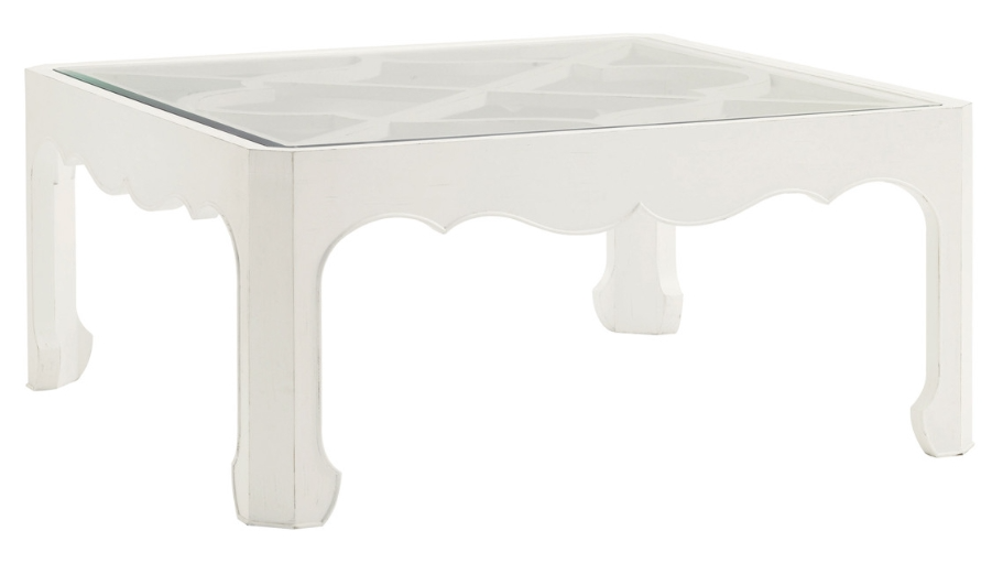 The inset glass top highlights the quatrefoil fretwork underneath. The cantered legs with shapely apron features a small raised edge adding a final detail to this creative design. This piece offers a spirited take on refined island living.Read More